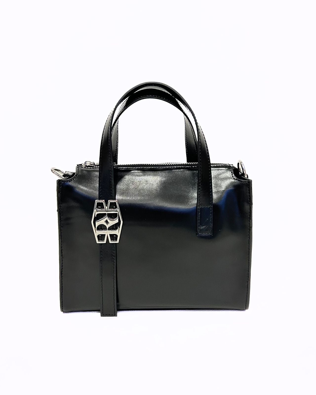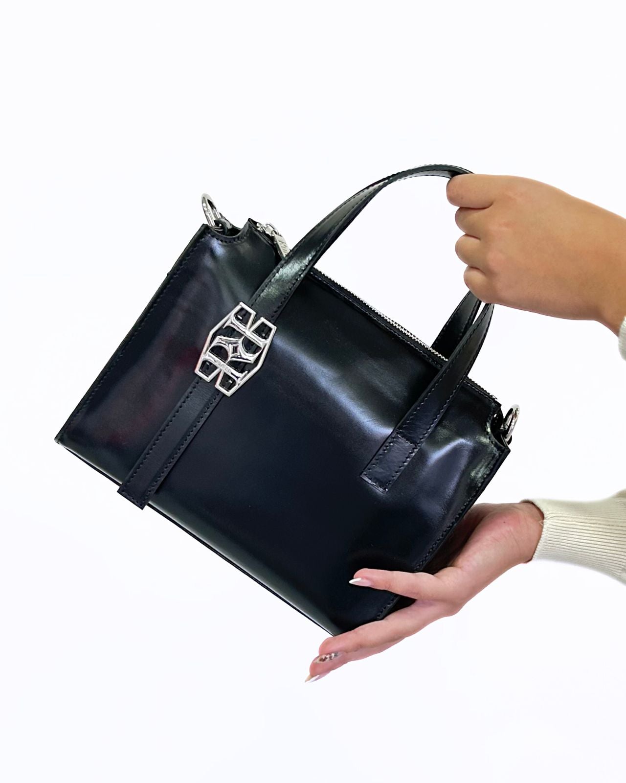 Mala de Mão Rufel Preta é a definição perfeita de elegância moderna. Com acabamento em pele de brilho intenso e detalhe metálico frontal exclusivo, este modelo combina sofisticação e atitude num design intemporal. Compacta, estruturada e com alça removível, pode ser usada tanto ao ombro como na mão, adaptando-se a qualquer ocasião.