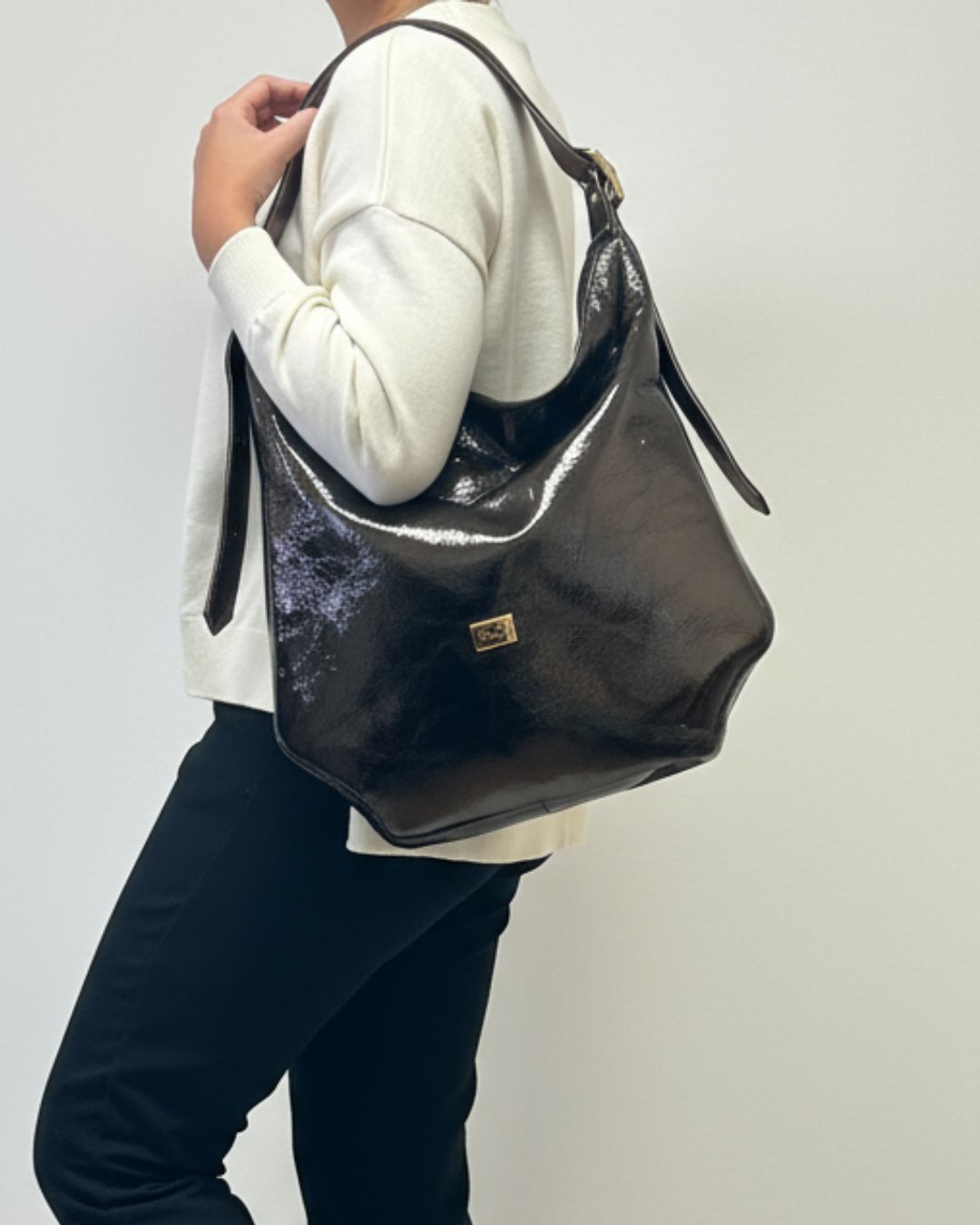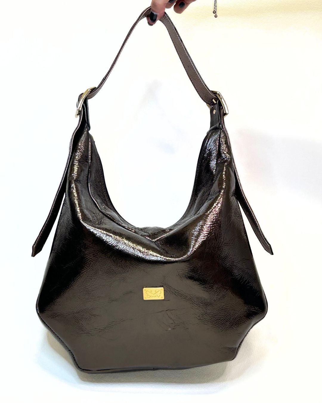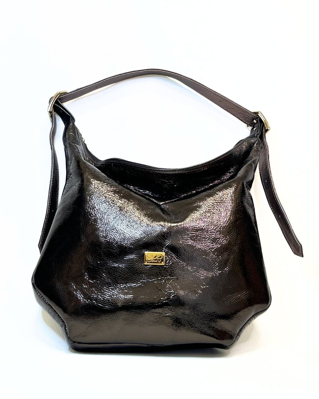 Com um acabamento em verniz metálico confere um toque luxuoso e moderno, ideal para elevar qualquer look. O tecido macio estilo hobo e alça ajustável, oferece versatilidade e leveza para o dia a dia, sem perder o charme sofisticado que distingue a marca Dona V.
