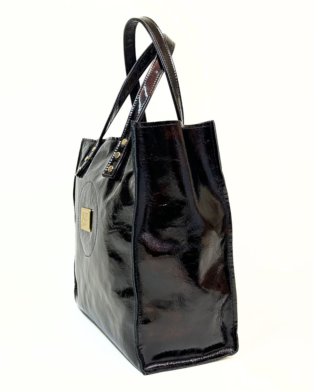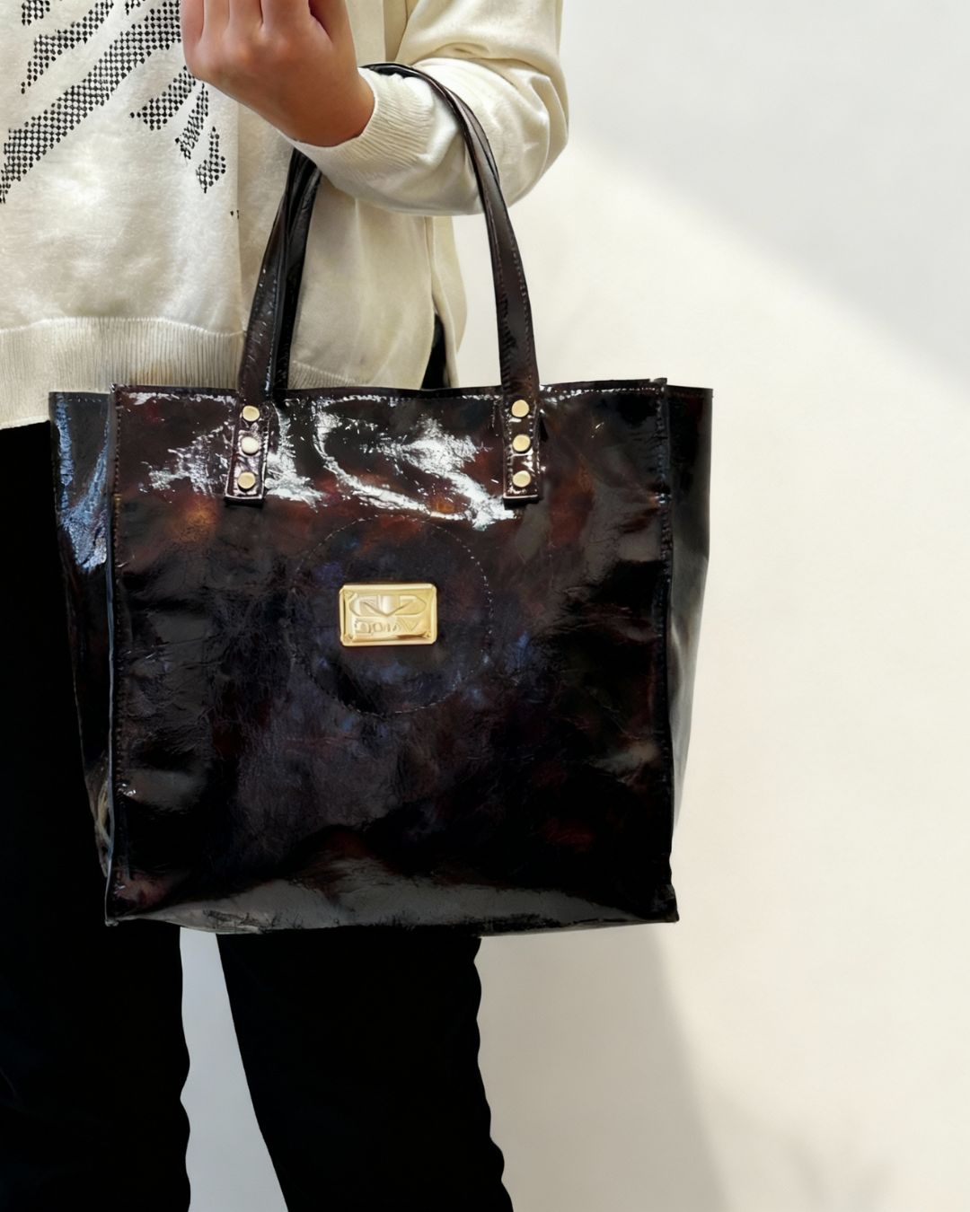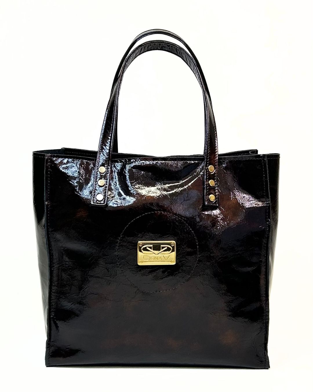 A Mala Dona V Verniz Castanho Escuro é a definição de sofisticação discreta. O acabamento em verniz espelhado reflete a luz com elegância, revelando subtis nuances em tons preto e chocolate.
