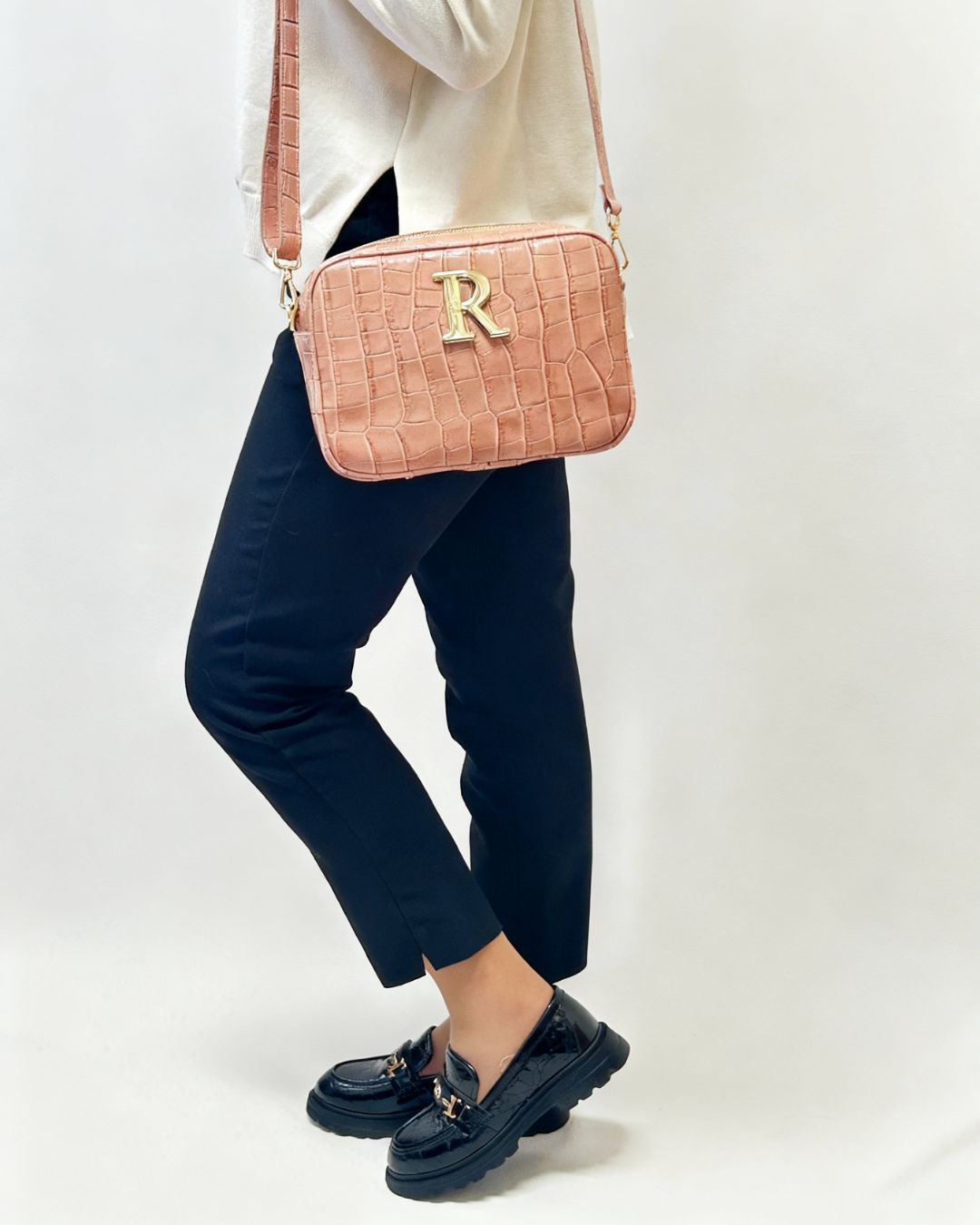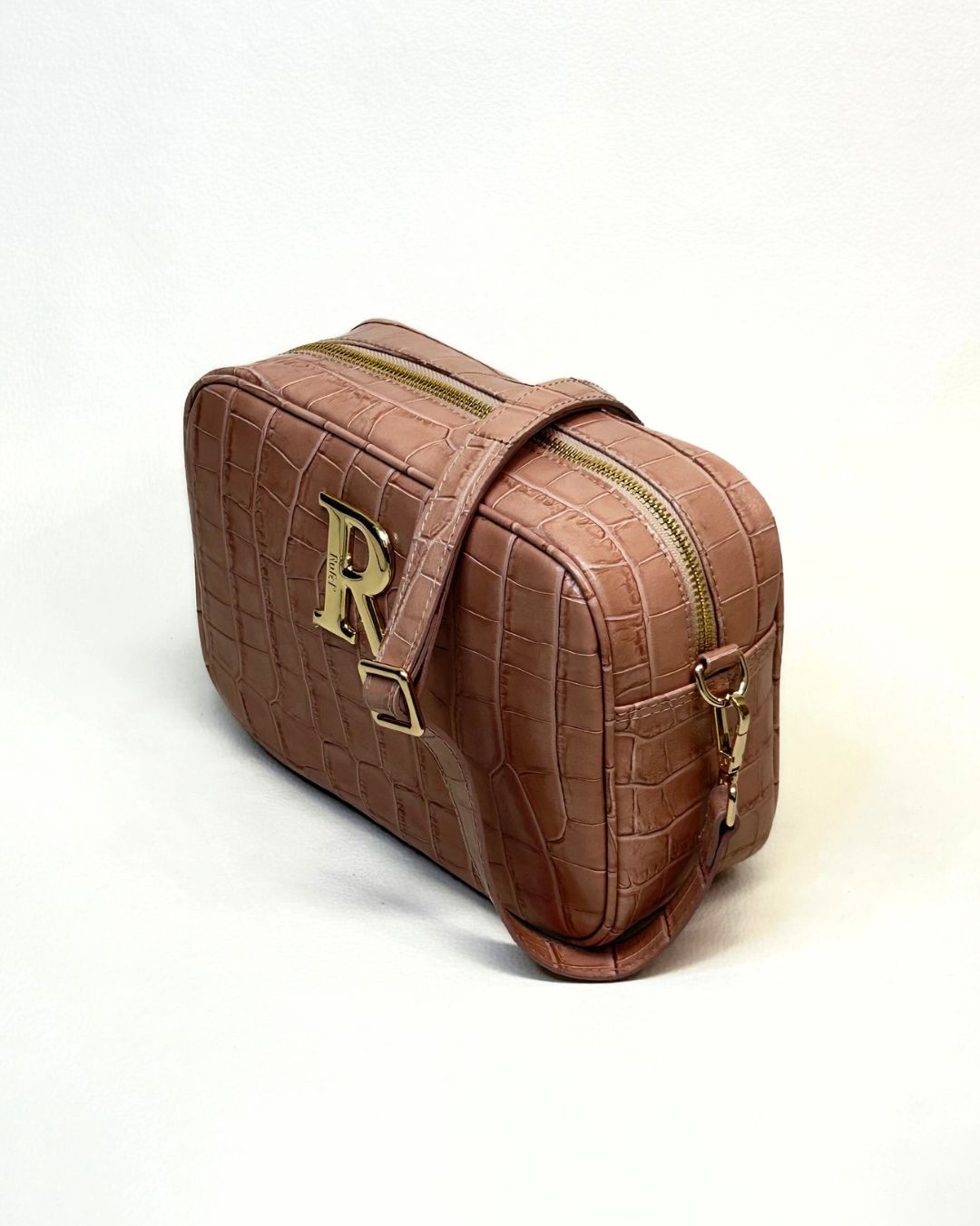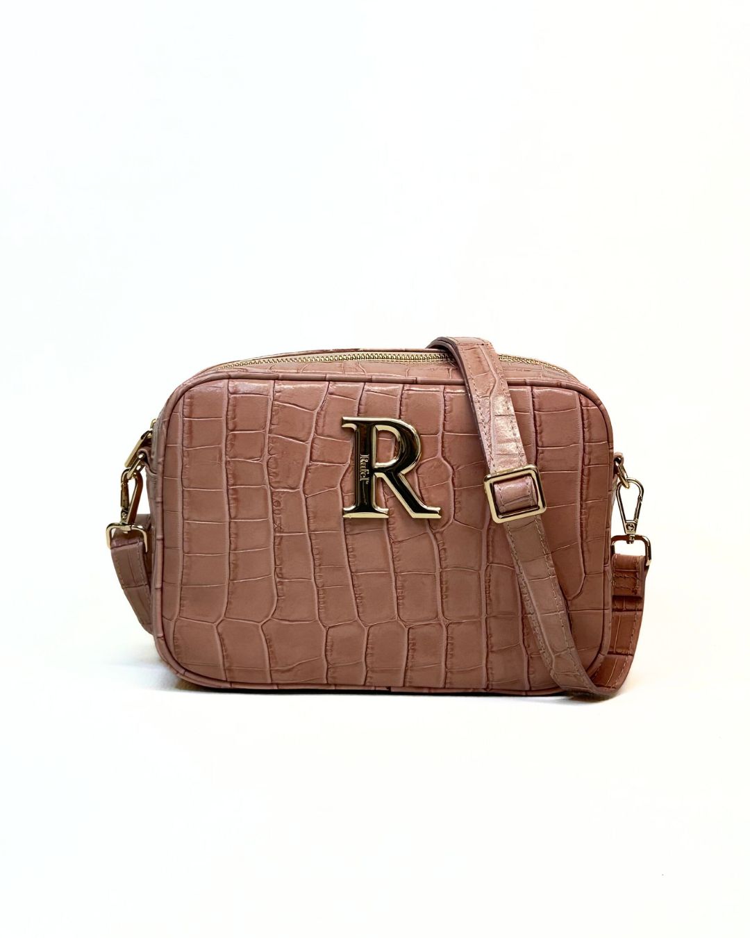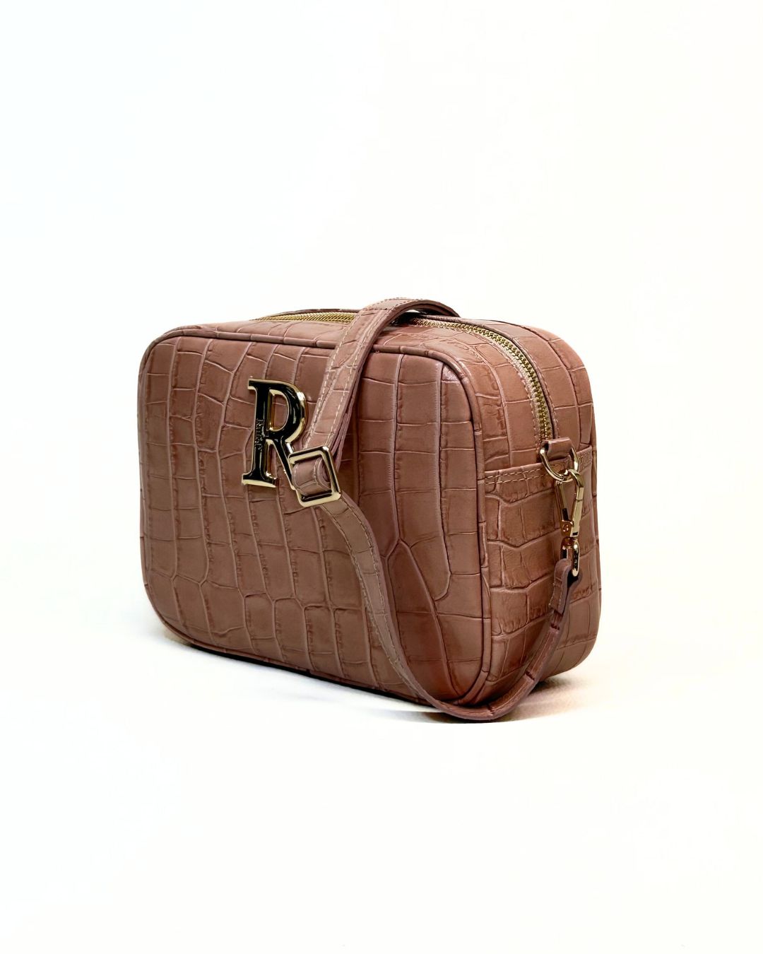 Com acabamento em pele texturizada estilo croco e o icónico “R” metálico dourado, esta mala é ideal para mulheres que valorizam o detalhe e o bom gosto.