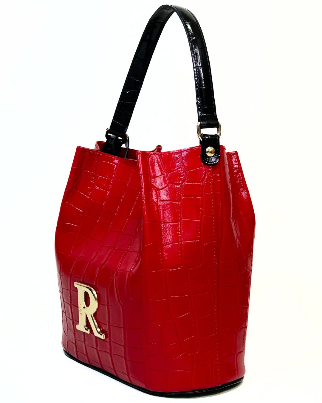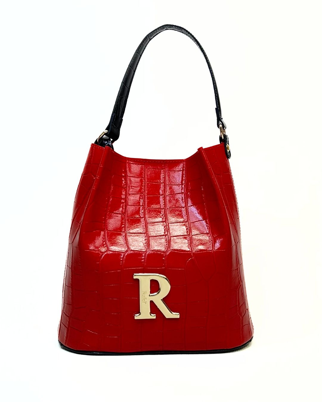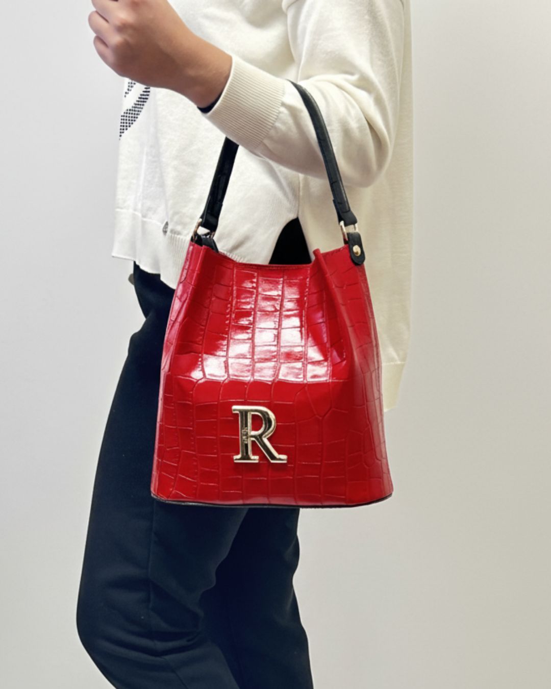 Com acabamento em pele com textura croco e o emblemático “R” metálico em dourado, este modelo destaca-se pelo design moderno e imponente.