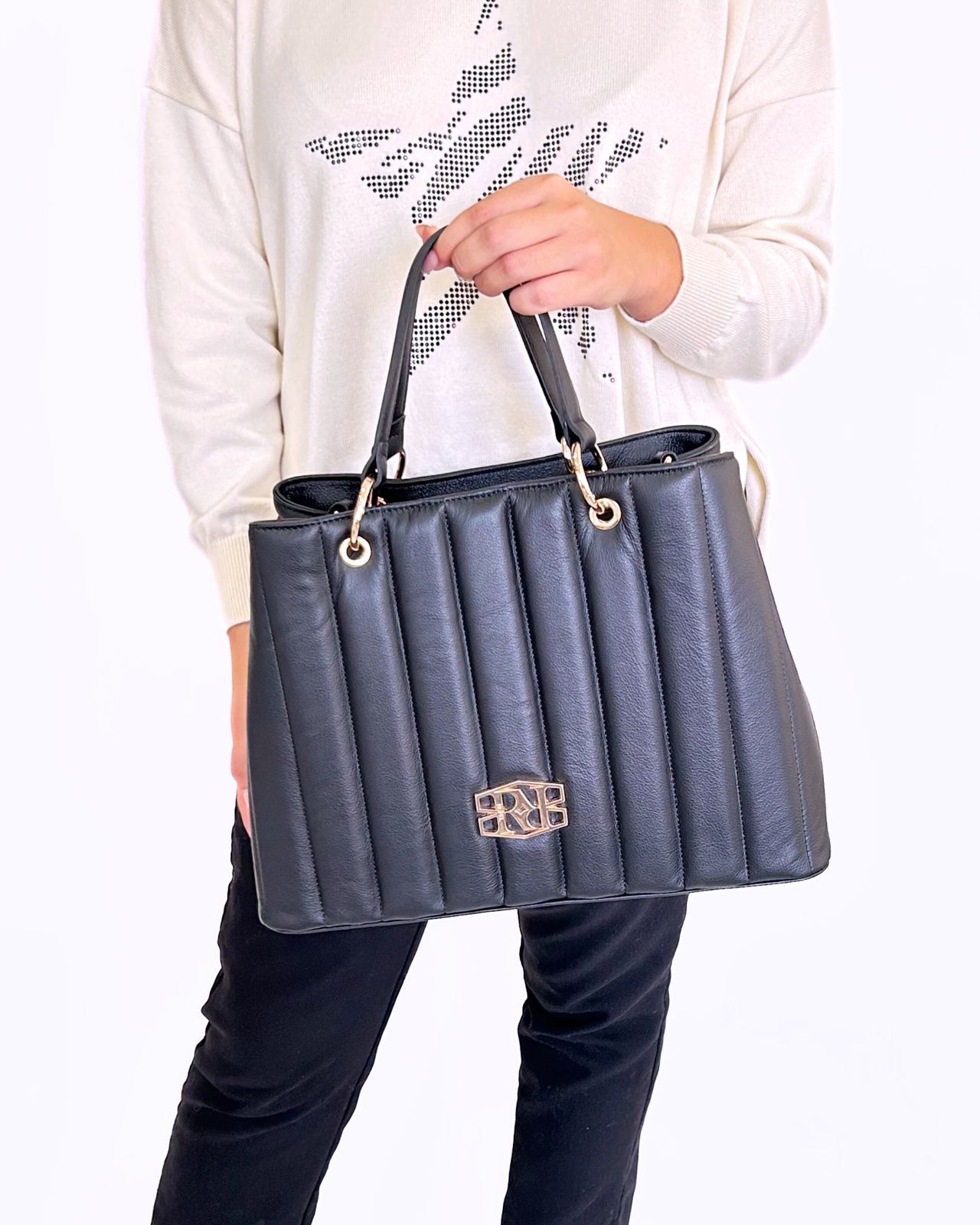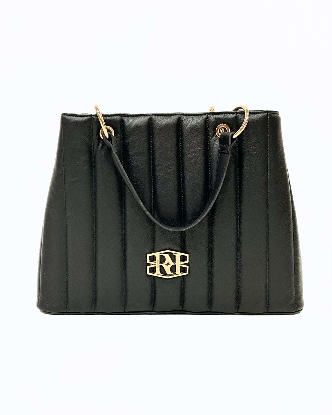 A Mala Rufel Preta Acolchoada é a união perfeita entre elegância e funcionalidade. Produzida em pele macia com costura vertical e detalhe metálico dourado com o logótipo Rufel, esta mala adapta-se facilmente a qualquer estilo.