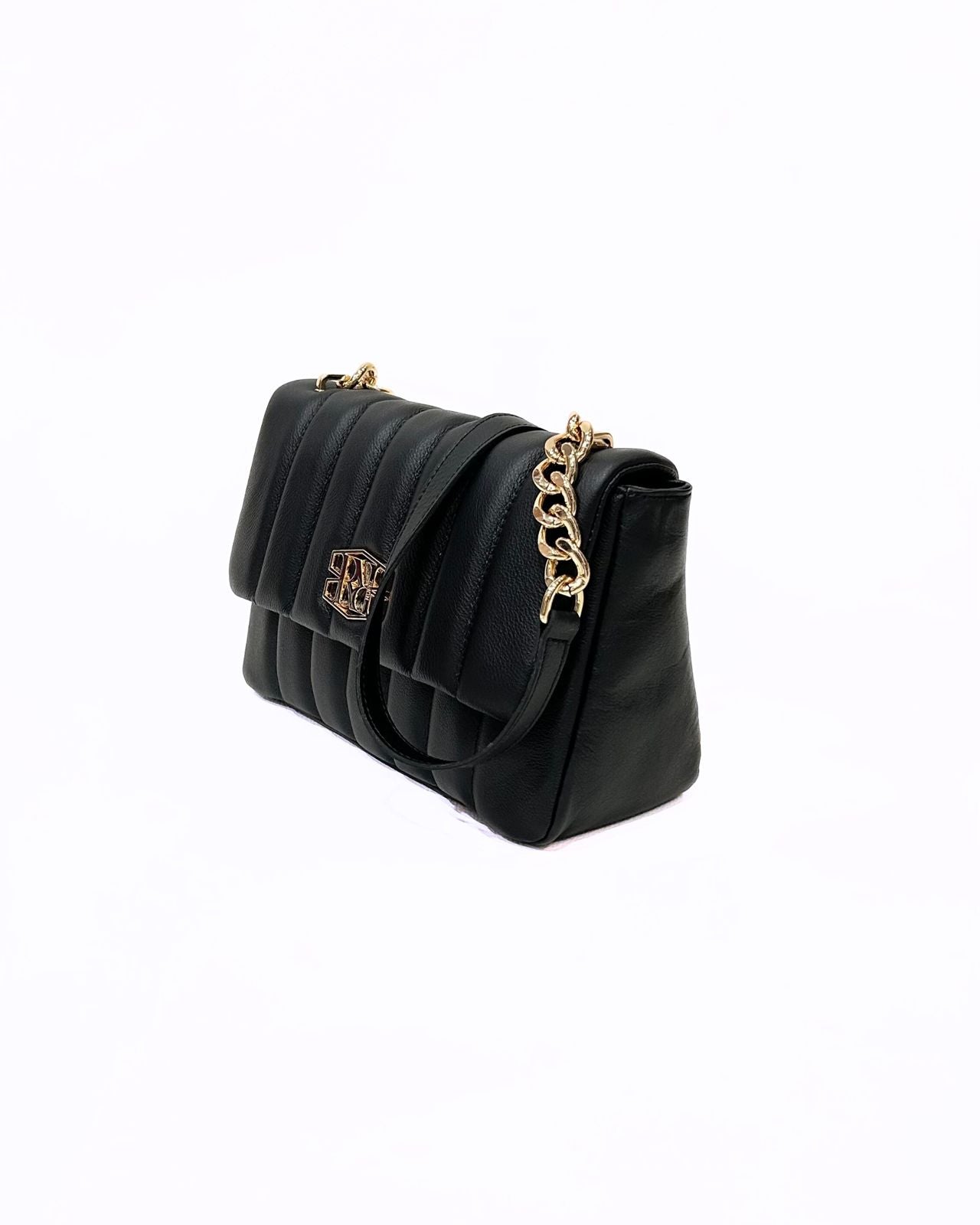 A alça de corrente dourada com detalhe em pele permite usá-la ao ombro ou em tiracolo, adaptando-se com facilidade a diferentes estilos e ocasiões. Com interior espaçoso e acabamento premium, é a escolha ideal para quem procura sofisticação, conforto e versatilidade num só modelo.