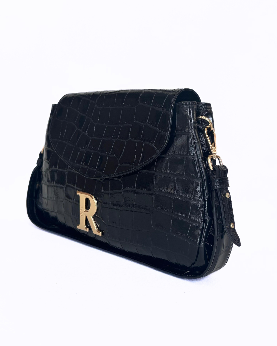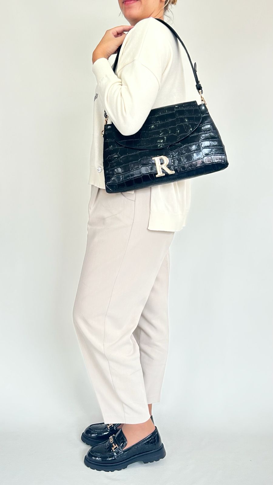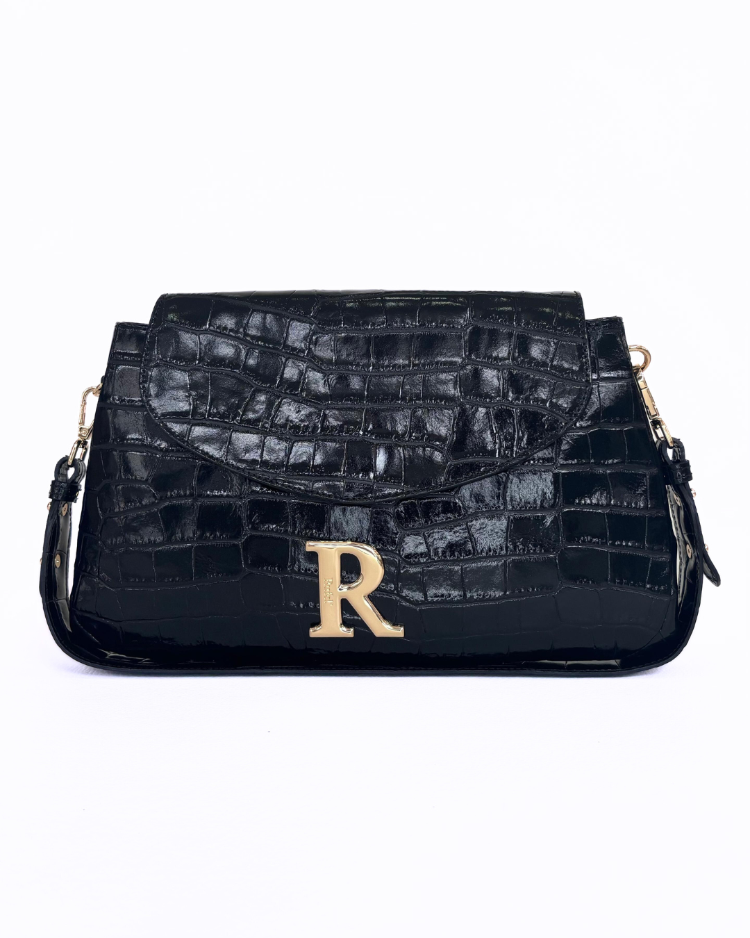 O detalhe metálico dourado com o icónico “R” da marca acrescenta sofisticação, enquanto a alça de ombro ajustável garante conforto e praticidade no uso diário.